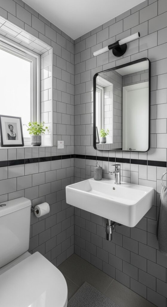 Consider mixed grey and white tiles for subtle variation that adds depth without overwhelming your small space. Install stacked grey subway tiles vertically instead of traditional brick patterns for an ultra-modern twist.