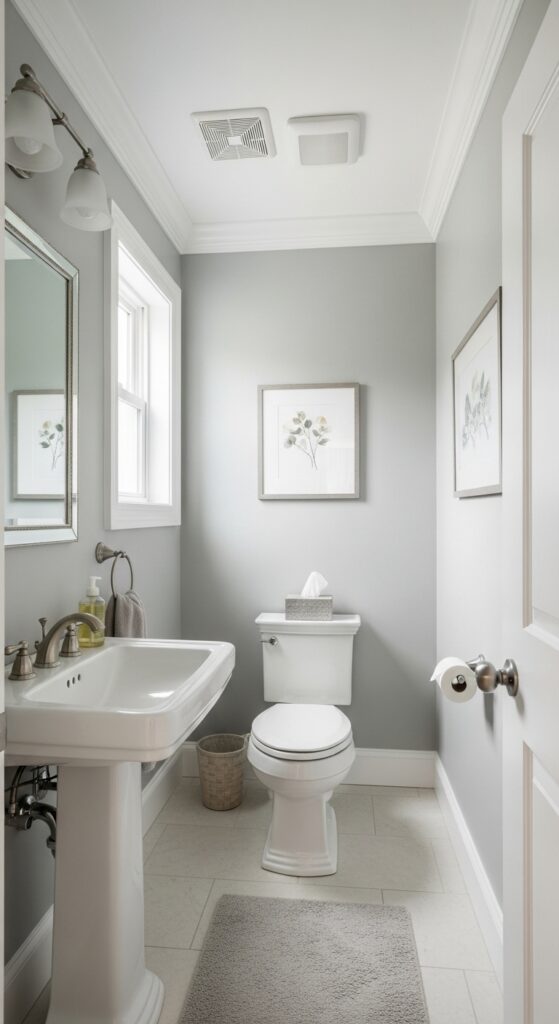 When you’re designing a half bathroom that exudes sophistication and versatility, light grey walls paired with crisp white trim create an unbeatable foundation. These soothing grey hues provide endless decorating possibilities while maintaining clean, modern appeal.