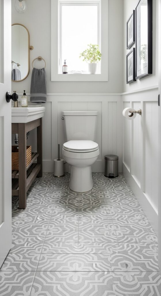 Statement flooring metamorphoses your half bathroom from ordinary to extraordinary, especially when you select patterned grey tiles that anchor the entire design scheme. You’ll create visual impact through geometric hexagons, intricate Moroccan motifs, or bold chevron patterns that draw the eye downward.