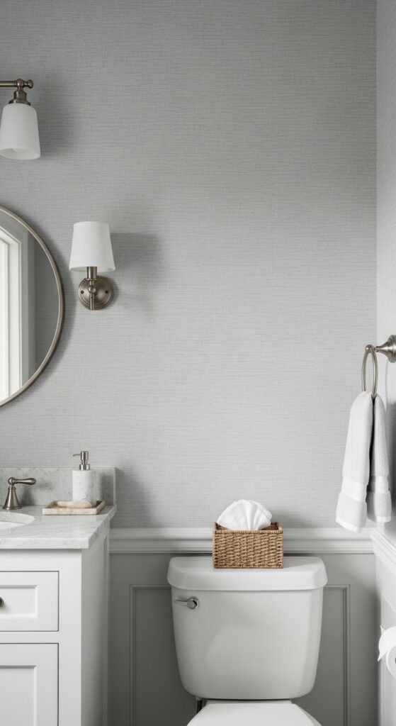 Textured grey wallpaper alters your half bathroom’s walls into refined focal points that complement rather than compete with your flooring choices. You’ll uncover soft grey textures like linen weaves, grasscloth patterns, or embossed geometric designs that add depth without overwhelming your compact space.