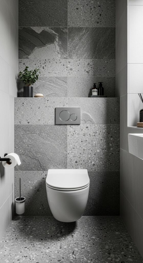 Several textured grey stone tiles convert your half bathroom into a sophisticated retreat that showcases natural beauty and timeless elegance. You’ll create stunning visual depth by installing a stacked stone accent wall behind your vanity or toilet area.