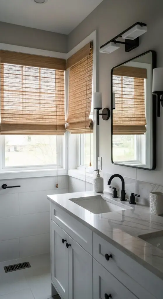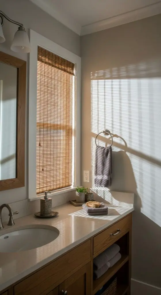 Choose blinds in weathered driftwood tones to complement coastal or spa-inspired décor themes. The woven bamboo material filters light beautifully, offering privacy without blocking natural illumination completely. This bright, spacious feel is especially important in compact guest bathrooms where natural light maximizes the perceived room size.