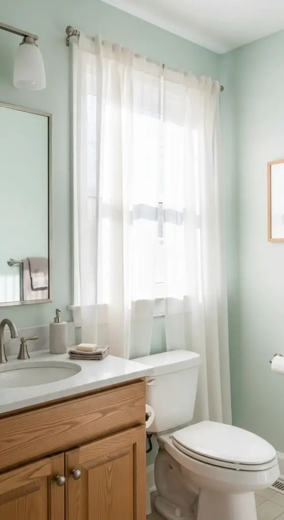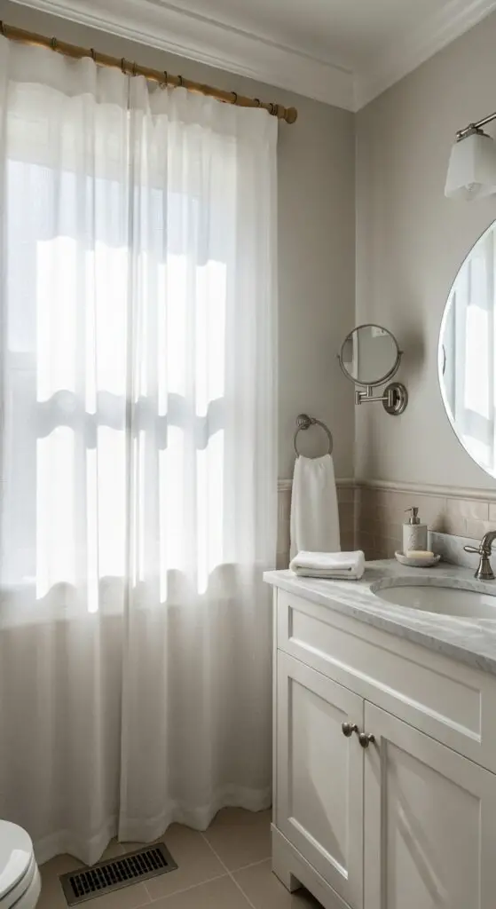 Choose white or cream sheers for maximum light transmission, or select soft pastels to add subtle color. Install them on tension rods for easy removal during cleaning, giving your guests the freedom to adjust privacy levels as needed. These window treatments are particularly valuable in small guest bathrooms where every design element must work harder to maintain both function and visual appeal.