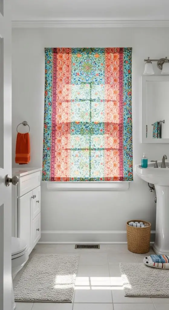 If you’re looking to make a bold design statement, repurposing colorful shower curtains as window treatments offers an affordable and creative solution for your guest bathroom. Choose lively patterns or solid colors that complement your existing décor while adding character to the space.