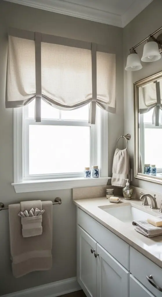 Roman shades bring an enhanced level of sophistication to guest bathrooms with their crisp, geometric lines and polished appearance. You’ll love how their graceful pleats create visual interest while maintaining the chic minimalism that makes small spaces feel larger and more organized.