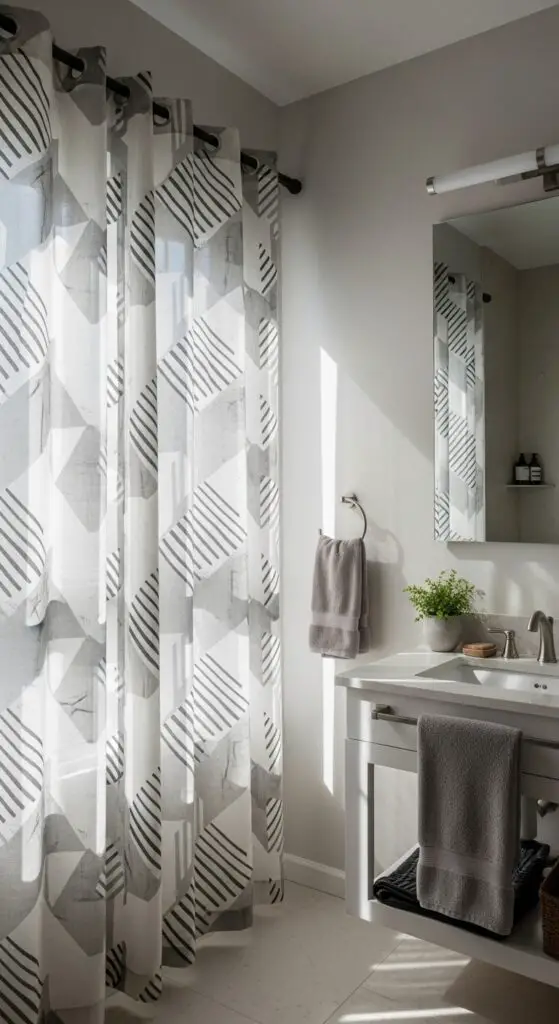 Choose minimalist patterns featuring clean lines and subtle color contrasts for maximum impact. Triangle motifs, hexagonal shapes, or angular stripes redefine ordinary windows into architectural statements. You can pair bold geometrics with neutral wall colors to maintain balance, or select monochromatic designs that complement existing fixtures while adding textural interest to your modern guest bathroom.