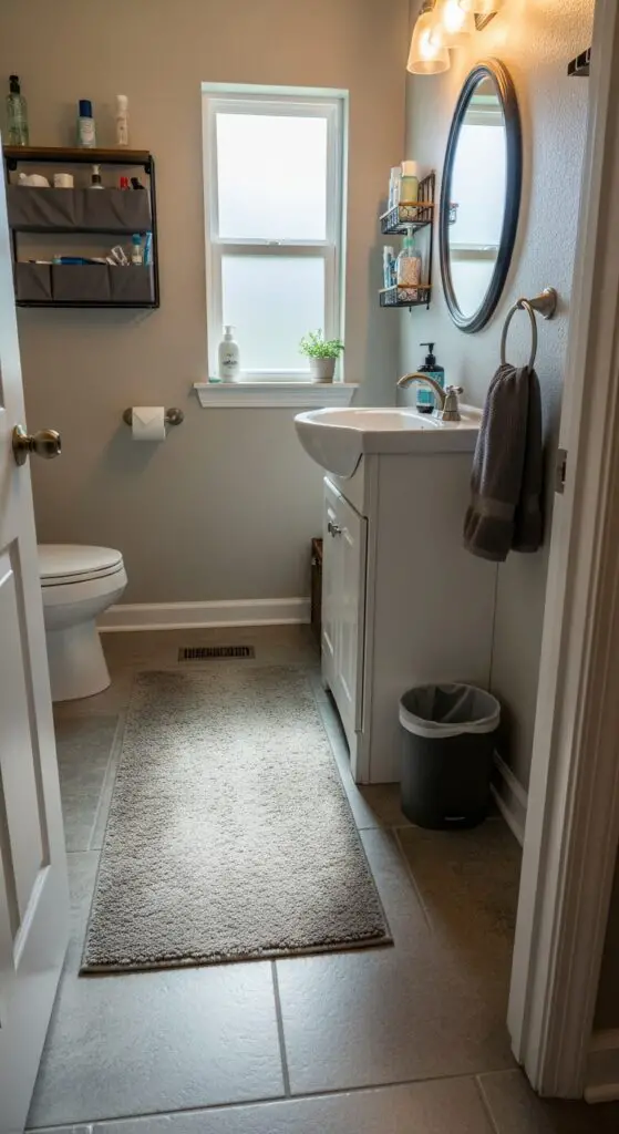 Select narrow runners that fit perfectly alongside your vanity without blocking cabinet doors or drawer access. Round rugs work exceptionally well in tight corners, creating flow around pedestal sinks. Consider space saving storage solutions like wall-mounted organizers to keep floor areas clear for your rug placement.