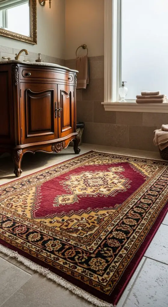 Choose washable Persian-style rugs with intricate designs in deep burgundies, navy blues, or rich golds for maximum impact. Position them strategically near vanities or entrances where they’ll catch attention immediately. You’ll appreciate how these rugs balance durability with beauty, creating an upscale hotel-like atmosphere that makes guests feel pampered and valued in your home. The classic details inherent in vintage Persian designs add authentic character that transforms your guest bathroom into a space with enduring appeal.