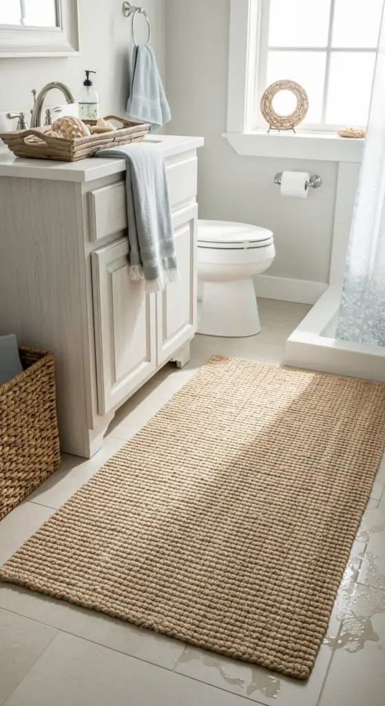 Consider textured sisal rugs for added grip and visual interest, especially near shower areas where safety matters most. Durable seagrass mats work beautifully alongside whitewashed vanities and ocean-inspired accessories. These natural fibers dry quickly and resist mold, making maintenance effortless. You can easily swap styles seasonally while maintaining that relaxed, vacation-home atmosphere your guests will appreciate.