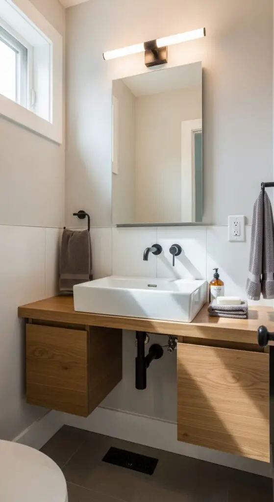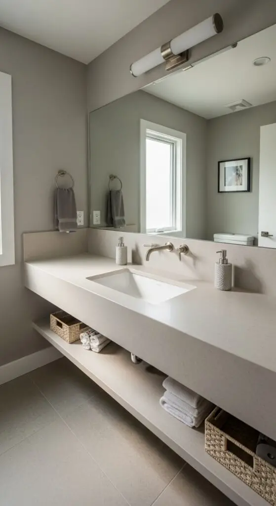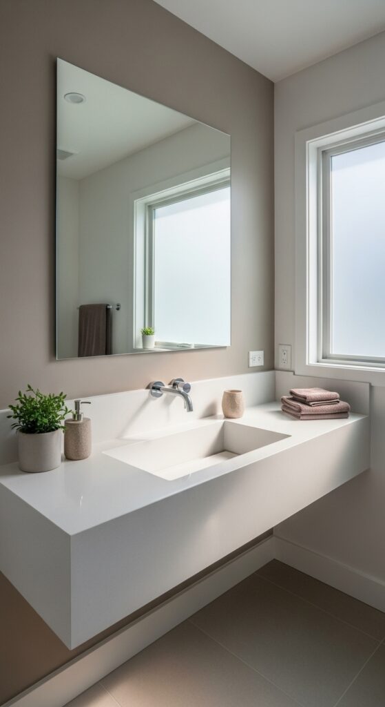 Floating vanity designs paired with integrated sinks enhance the streamlined effect. Mount these combinations directly to walls, creating an airy feel that makes small guest bathrooms appear larger and more open than traditional cabinet-style installations.