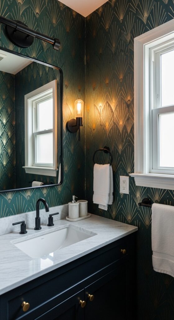Choose wallpapers featuring shimmering metallics like gold, silver, or copper to reflect light beautifully in smaller spaces. Consider incorporating subtle Art Nouveau motifs alongside traditional Art Deco elements for added elegance. Select rich color palettes including deep emerald, navy, or burgundy backgrounds that complement the metallic details and enhance your bathroom’s luxurious atmosphere.