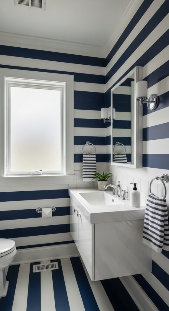 You’ll find horizontal stripes particularly effective for making narrow spaces appear wider while adding visual movement to plain walls. Choose navy and white combinations for a fresh nautical theme that feels both coastal and refined.