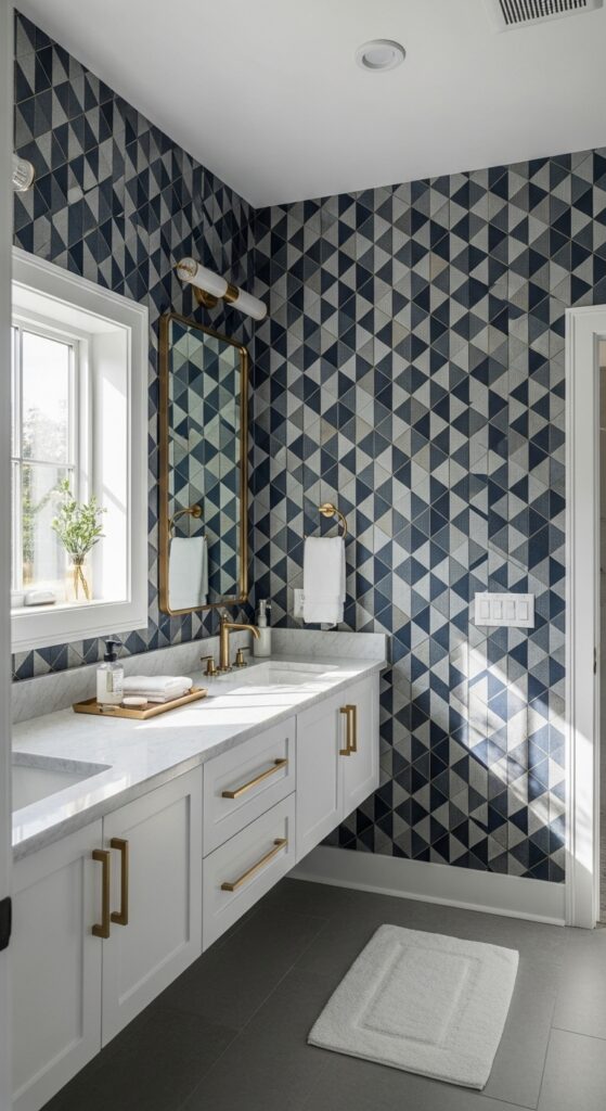 Bold florals aren’t your only path to stunning guest bathroom design—geometric patterns deliver clean lines and contemporary elegance that never goes out of style. You’ll find hexagons, triangles, and overlapping shapes create visual interest without overwhelming small spaces. Choose patterns in complementary hues like navy and gold or black and white for maximum impact.