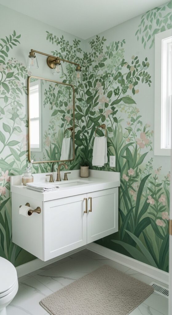 Focus one accent wall behind the vanity or toilet to avoid overwhelming the space while creating a stunning focal point. For an even more striking effect, pair your botanical prints with bold black accents in fixtures or trim to achieve a sophisticated modern aesthetic.