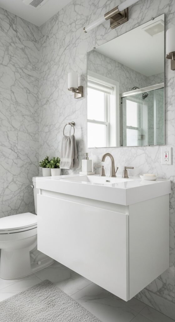 Install minimalist stone backsplashes behind floating vanities to maximize visual interest without overwhelming smaller rooms.