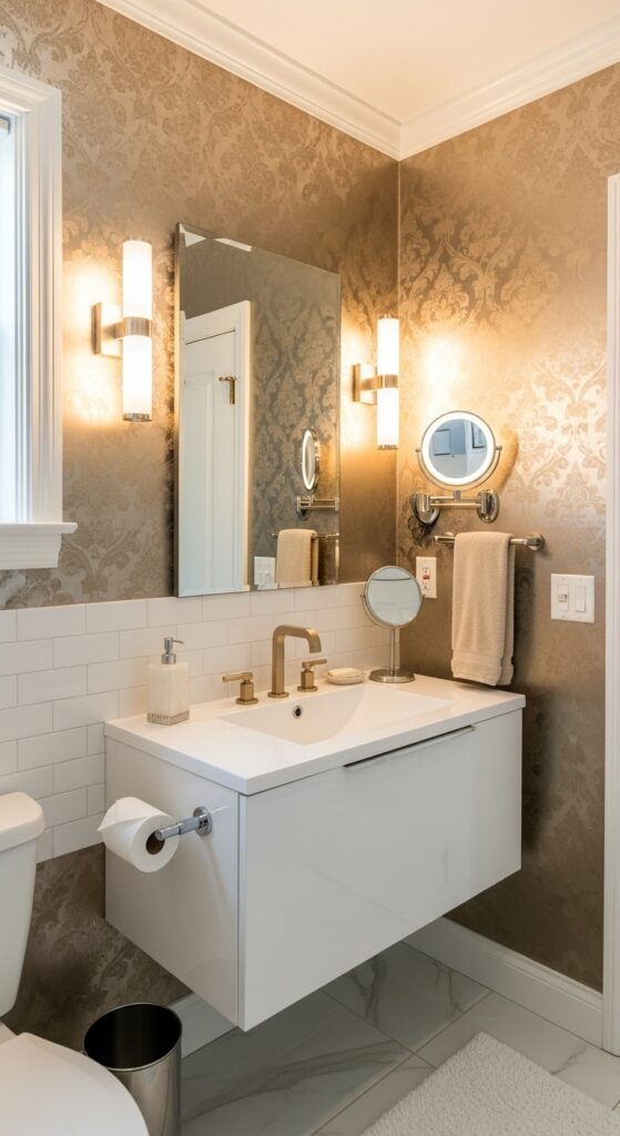 Metallic wallpapers bring luminous sophistication to guest bathrooms while amplifying natural and artificial light throughout the space. You’ll find shimmering metallics in gold, silver, copper, and bronze tones that instantly heighten your bathroom’s ambiance. These reflective finishes work particularly well in powder rooms where you want maximum impact with minimal square footage.
