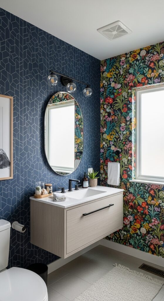 Experimental mixed media approaches work exceptionally well behind vanities or toilet areas. You can blend textured grasscloth with metallic stripes, or combine vintage florals with modern abstracts. Start with complementary color palettes, then introduce contrasting patterns gradually. This technique reshapes bland walls into conversation starters while maintaining cohesive design flow throughout your guest bathroom.