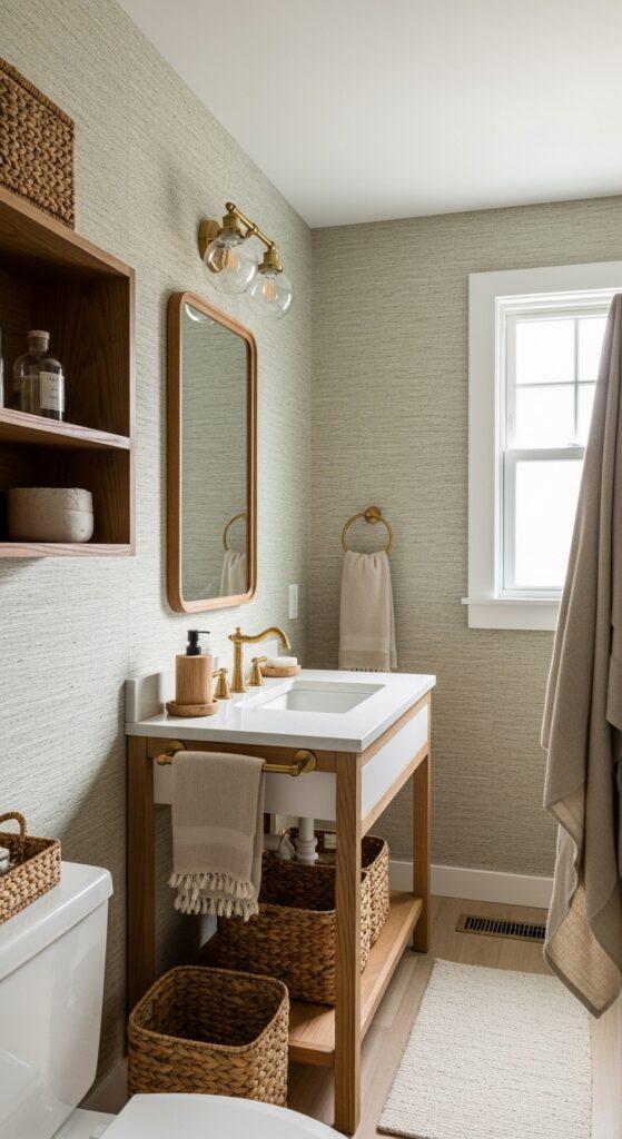 Choose patterned grasscloth in neutral tones like sage, cream, or soft gray for maximum versatility with your existing fixtures. These natural fibers work exceptionally well in powder rooms where moisture levels remain manageable. Consider pairing grasscloth with brass fixtures and wooden accents to enhance the organic aesthetic and create a cohesive design.
