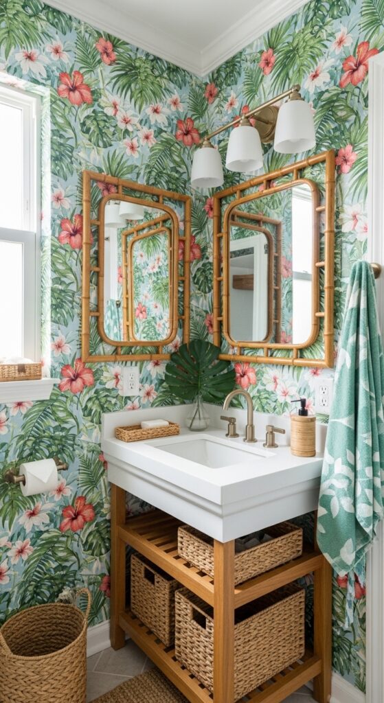 Choose coastal inspired motifs featuring soft blues and sandy beiges for subtle elegance, or welcome bold tropical floral designs with vibrant greens and coral accents for dramatic impact. These patterns work exceptionally well as accent walls behind vanities or throughout powder rooms.