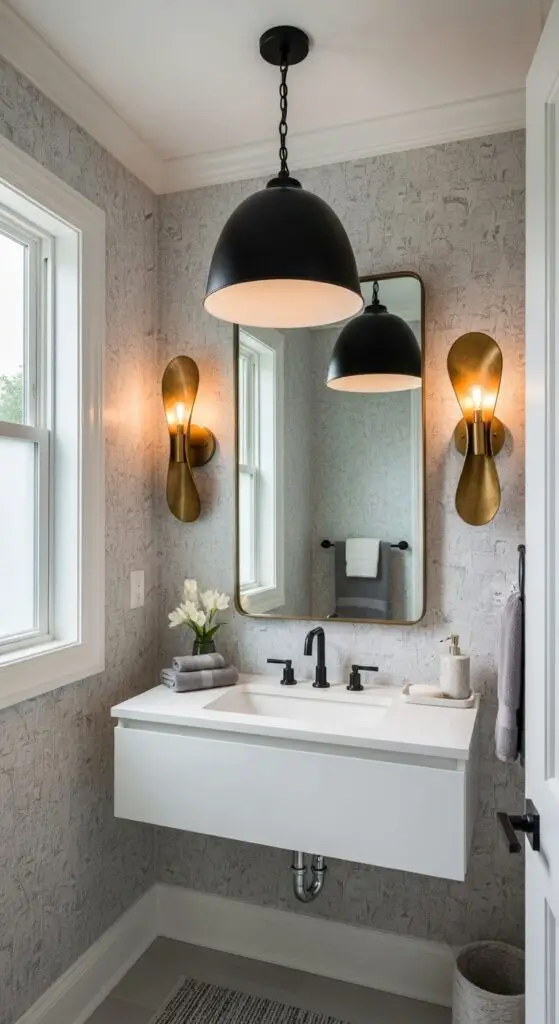 Consider sculptural wall sconces flanking your mirror to add symmetrical elegance and eliminate harsh shadows on faces. Choose fixtures with unique materials like brushed brass, matte black, or textured glass to complement your design aesthetic. For an especially dramatic and modern aesthetic, bold black fixtures create striking contrasts against lighter walls and surfaces. These dramatic lighting elements instantly uplift your compact space, making guests feel they’ve entered a high-end boutique hotel rather than a basic powder room.