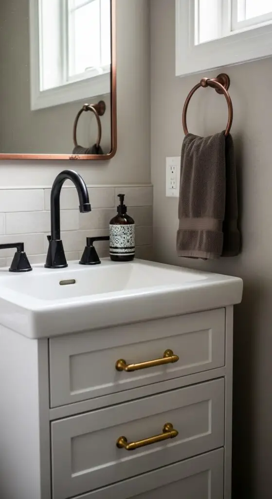 Consider contrasting fixtures like warm gold handles paired with cool chrome towel bars for visual interest. Unique finishes such as brushed copper or oil-rubbed bronze add character without overwhelming compact spaces. Don’t match everything perfectly—mixing metals creates depth and personality.
