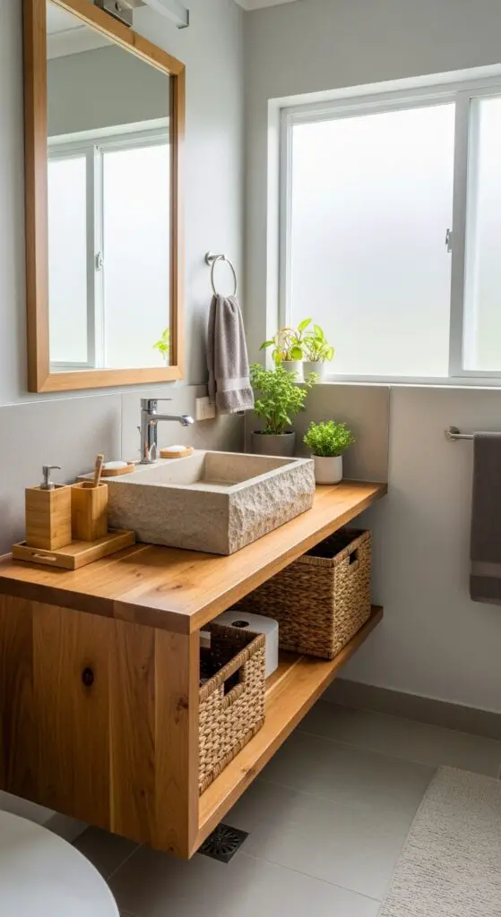 Natural stone accents create stunning focal points—consider river rock backsplashes or granite countertops that add organic texture. Bamboo accessories, woven baskets, and live plants amplify the earthy atmosphere while maintaining functionality. These materials work together to establish a warm, inviting environment that makes guests feel comfortable and connected to nature.