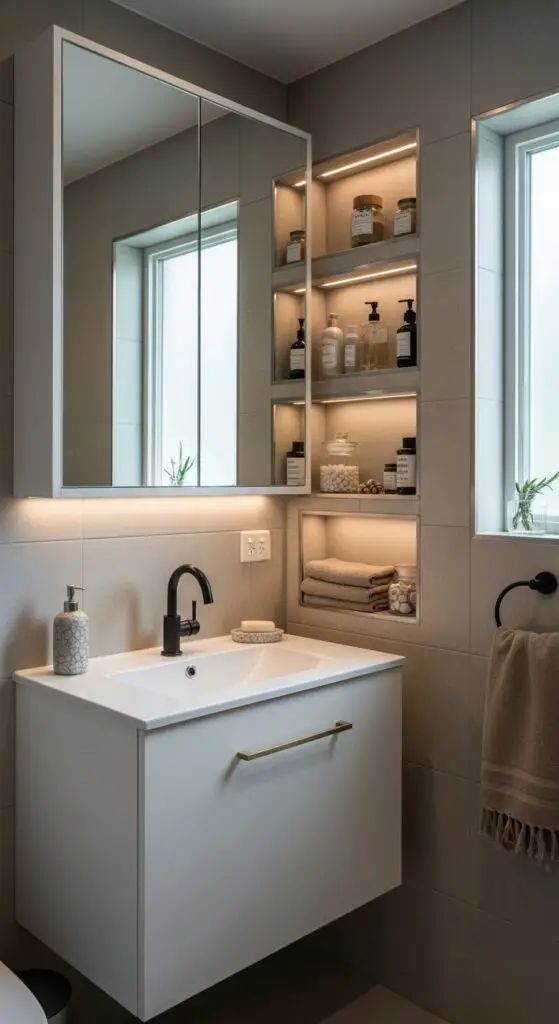 Corner niche storage alters unused wall spaces into practical shelving areas for toiletries and decorative items. These built-in alcoves maintain clean lines while offering convenient access. Consider adding LED strip lighting inside niches to highlight contents and create ambient illumination. Implementing clever storage solutions ensures your guest bathroom remains tidy and organized while maximizing every inch of available space. Both solutions integrate seamlessly with existing walls, preserving your bathroom’s open, uncluttered aesthetic.