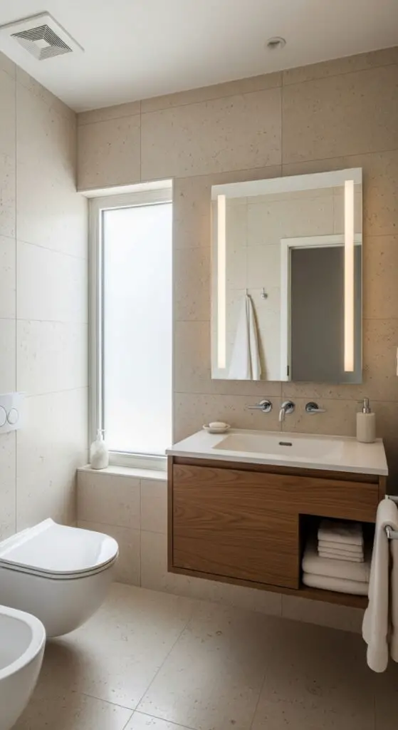 This wall-mounted solution allows natural light to flow freely, making your bathroom feel less cramped and more open. These smart design choices help maximize space while maintaining a stylish appearance throughout your compact guest bathroom.