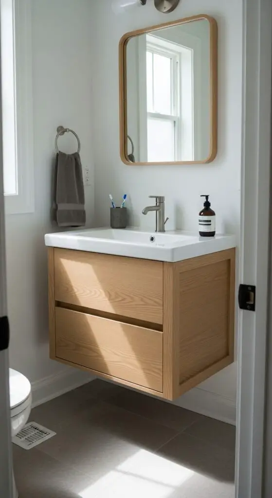 Choose designs that employ hidden storage through built-in drawers or shelving to minimize visual clutter. Select sleek, streamlined profiles in light colors or natural wood tones. You’ll maintain functionality while achieving that airy, spacious feeling your guests will appreciate in your thoughtfully designed half bathroom.