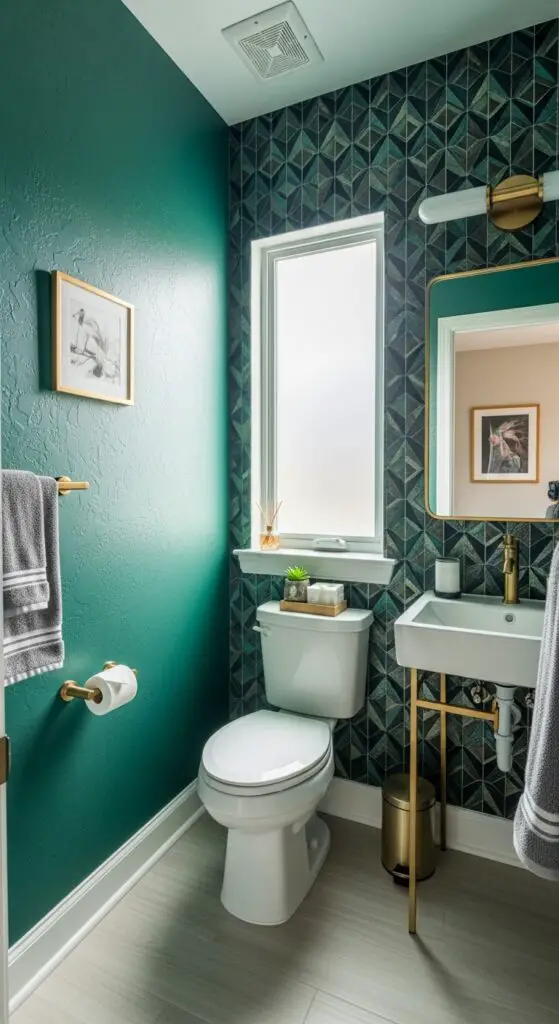 Since guest bathrooms are typically smaller spaces that visitors use briefly, they’re perfect candidates for experimenting with dramatic design choices you might hesitate to use elsewhere. You can adopt striking color combinations like deep emerald with gold accents or navy paired with coral without overwhelming your daily routine.