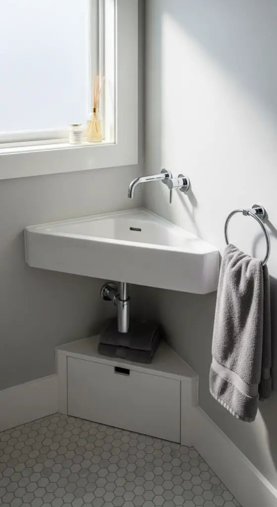 Wall-mounted corner units work exceptionally well in narrow spaces, while pedestal styles maintain a light feel that prevents your guest bathroom from appearing cramped.
