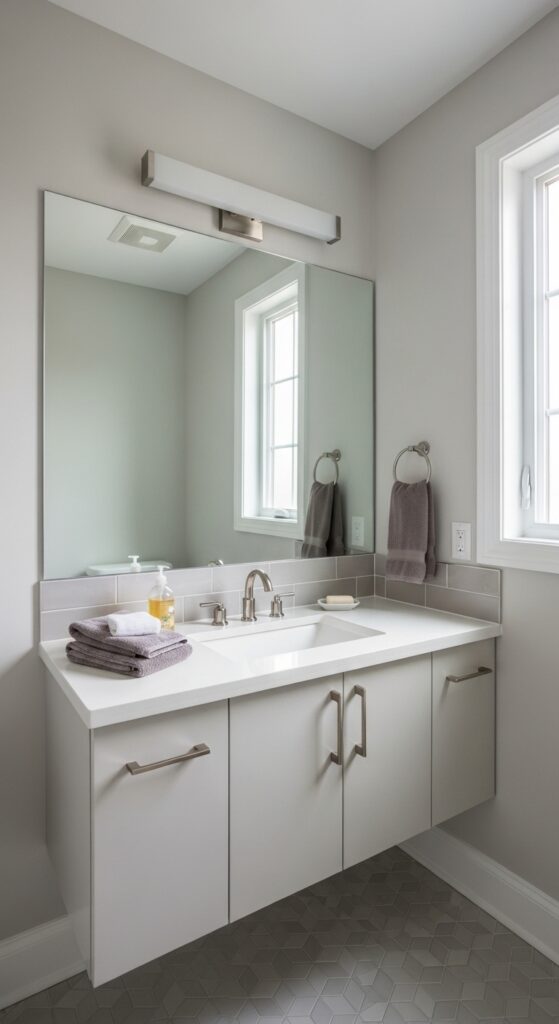 When you’re working with limited square footage in a guest half bathroom, strategically placed large mirrors create the illusion of expanded space by reflecting light and views throughout the room. Install a full-wall mirror behind your vanity to amplify space dramatically while doubling natural light from windows.