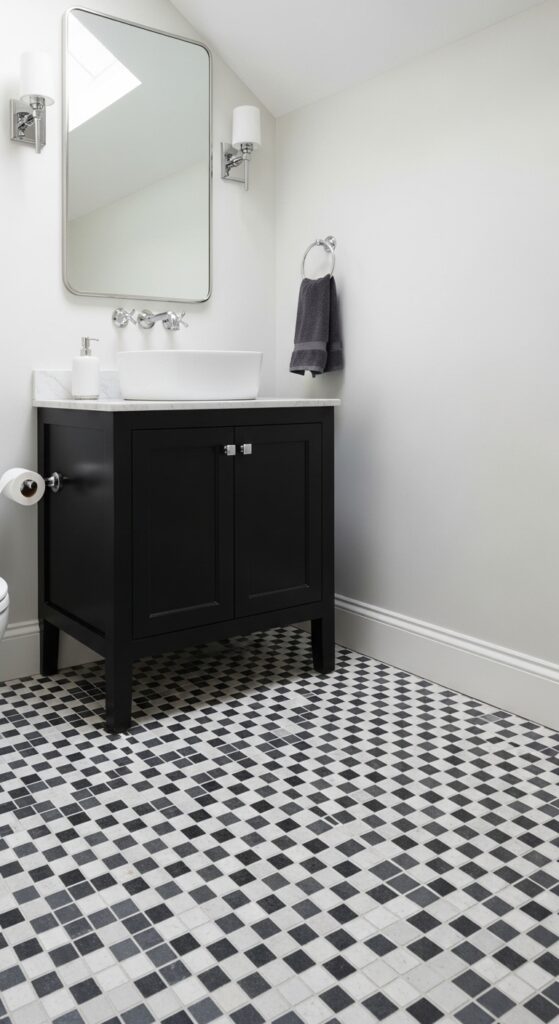 Black and white checkered floors deliver timeless elegance with bold visual impact that alters your half bathroom into a striking focal point. You’ll find this classic pattern works beautifully in modern minimalist designs, creating clean lines without overwhelming your compact space. The high contrast naturally draws attention upward, making your ceiling appear higher than it actually is.