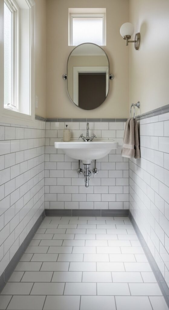 When you’re looking for a floor option that never goes out of style, classic subway tiles deliver both durability and sophisticated charm to your half bathroom. These rectangular tiles offer timeless simplicity that complements any design aesthetic you choose. You’ll appreciate how their clean lines create visual interest without overwhelming your compact space.