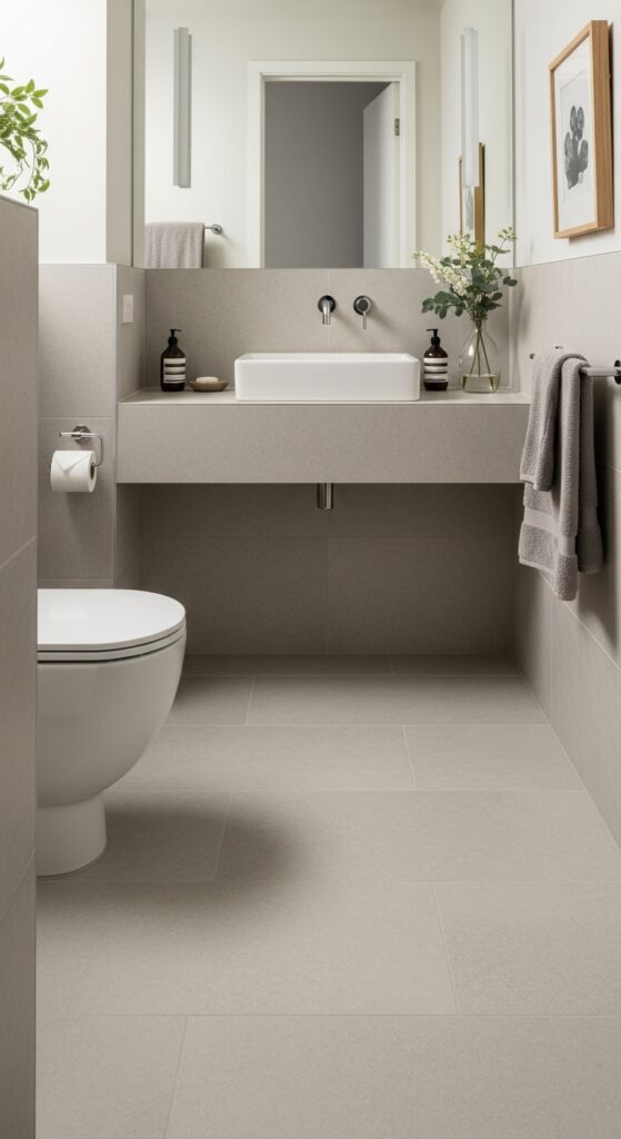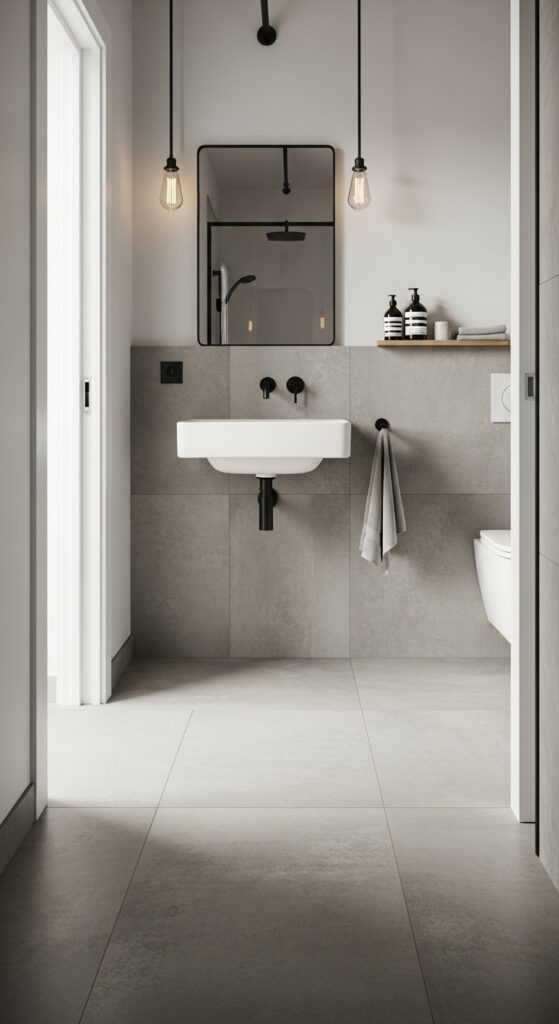 Choose porcelain tiles mimicking smooth concrete finishes for authentic texture and visual appeal. These options resist moisture while maintaining their sleek appearance through daily use. Consider waterproof epoxy coatings over existing floors for budget-friendly transformation that’s completely customizable.