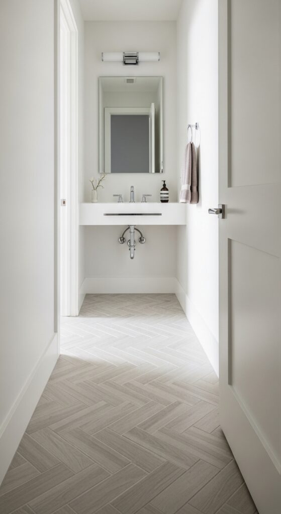 When you install herringbone flooring in your half bathroom, you’ll create an optical illusion that alters cramped quarters into an expansive, designer-worthy space. The angular zigzag pattern draws your eye across the room rather than highlighting its boundaries, making walls appear farther apart.