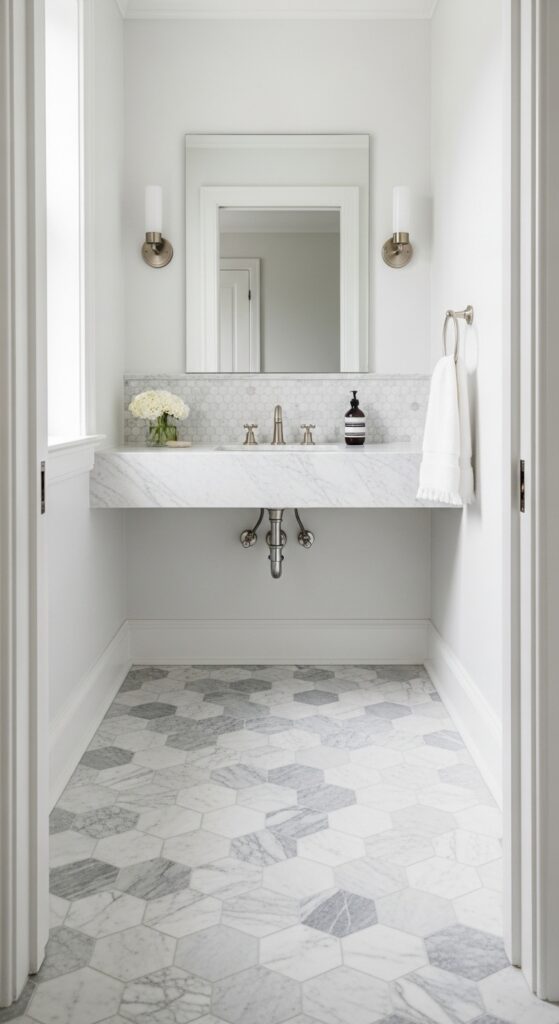Arrange your hexagons in traditional honeycomb patterns for classic elegance, or experiment with dazzling diamond patterns by rotating tiles forty-five degrees. White Carrara marble hexagons brighten small spaces, while darker Nero Marquina creates dramatic contrast. Mix different marble types within the same hexagonal layout to achieve custom geometric designs that reflect your personal style. The bright white tones naturally enhance the airy atmosphere that makes half bathrooms feel more spacious and welcoming.