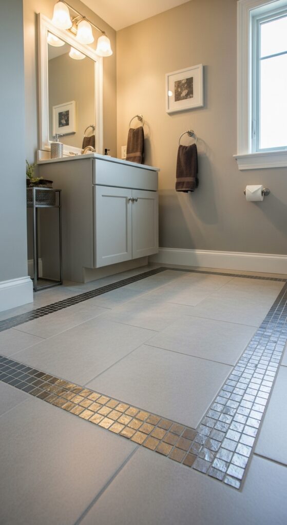 Metallic mosaic accents add warmth and luxury, reflecting light to expand your compact space visually. Shimmering glass mosaics create depth and motion, making your floor feel fluid rather than static. Choose colors that complement your existing palette while adding just enough contrast to create definition without overwhelming the room’s proportions.