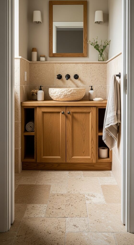 Natural stone tiles bring organic beauty and tactile richness to your half bathroom while creating a completely different atmosphere from geometric patterns. You’ll uncover endless possibilities when exploring travertine tiles, which offer warm honey tones and naturally occurring pits that create visual interest.
