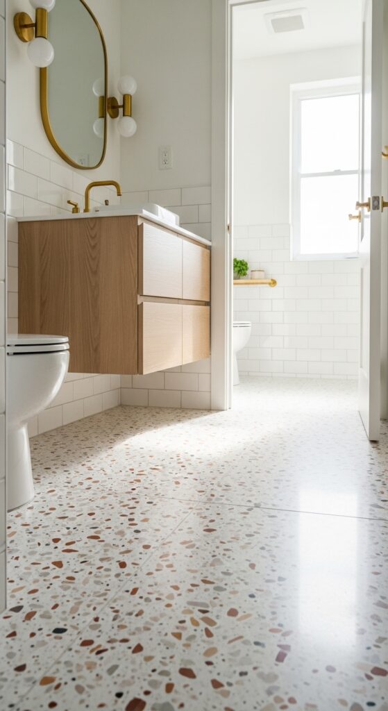 Choose polished terrazzo for maximum light reflection, making your small bathroom feel brighter and more spacious. The surface resists moisture and stains naturally, giving you worry-free maintenance for years. Pair it with white subway tiles and terracotta accessories to complete your Mediterranean aesthetic effortlessly and authentically.