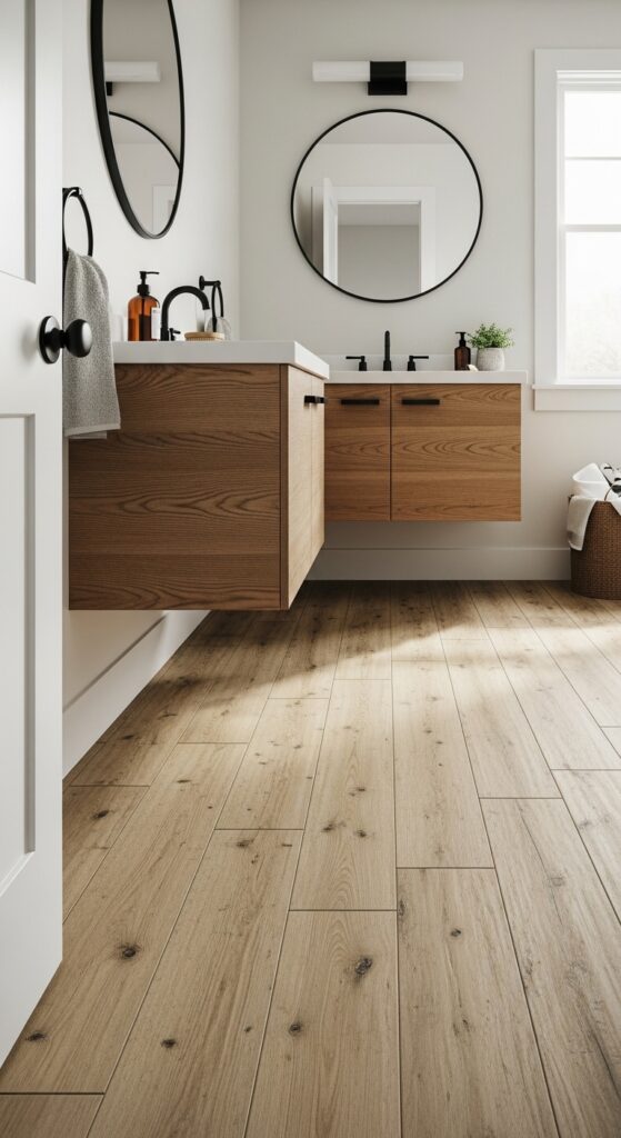 Choose tiles with a distressed wood finish to create authentic texture and character that mimics aged hardwood. Pair these floors with reclaimed wood accents like floating shelves or mirror frames to enhance the cohesive design story.
