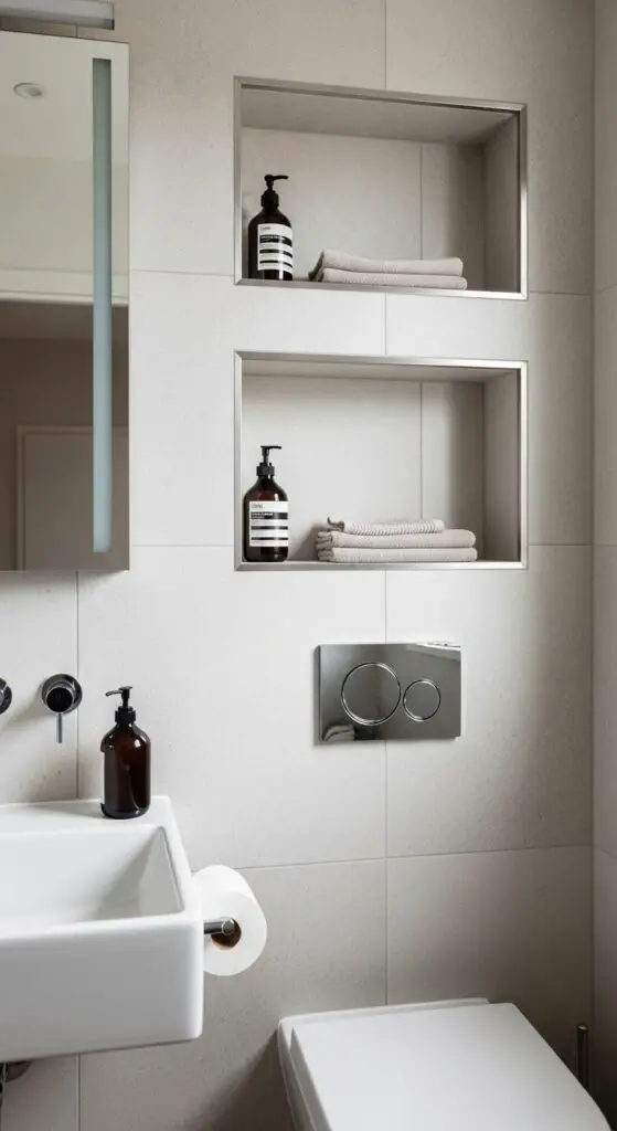 Position these integrated shelf units at eye level near your sink for toiletries and hand soap. Install deeper niches behind your toilet for storing extra supplies discreetly. You can tile the interior to match surrounding walls or contrast with accent materials for visual interest.