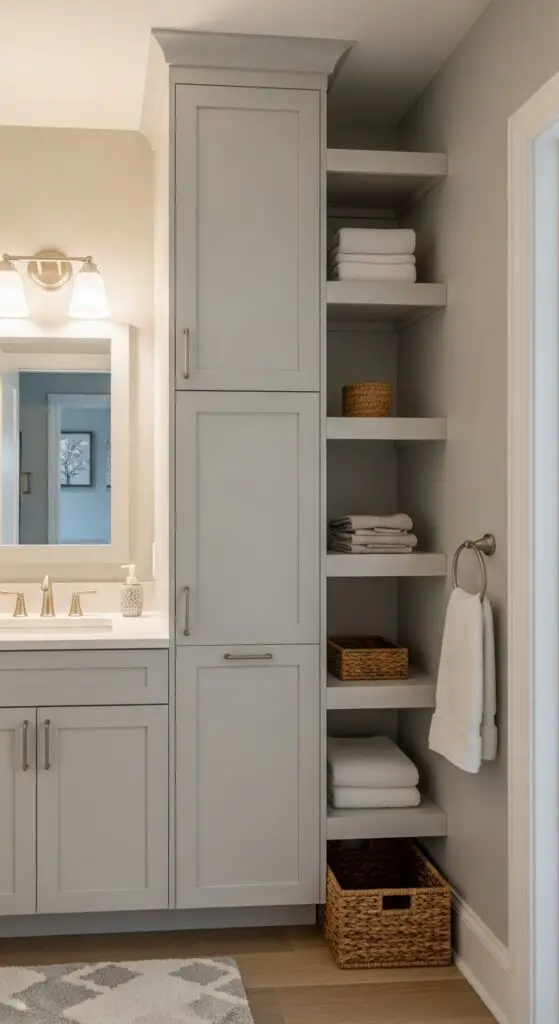 Focus on cohesive finishes and intentional placement to achieve a custom-built appearance that enhances your bathroom’s overall design aesthetic. Consider pairing your storage solution with a compact sink that maximizes counter space while maintaining the room’s streamlined appearance.