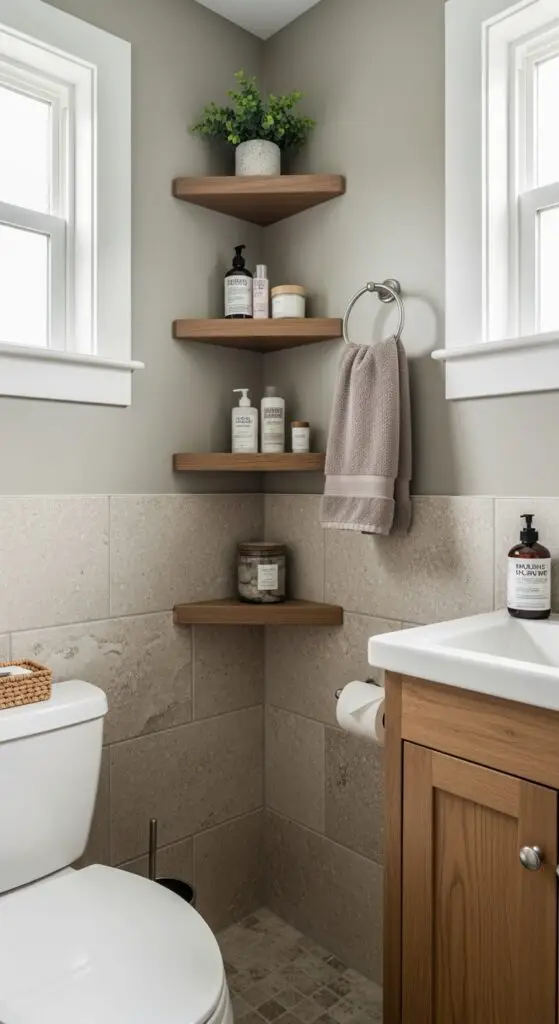 Most half bathrooms feature awkward corner spaces that homeowners overlook, yet these areas offer tremendous potential for creative storage solutions. You’ll uncover that corner-mounted triangular shelves maximize vertical space while maintaining your room’s flow. Install recessed shelves directly into corner walls for seamless storage that doesn’t protrude into walkways.