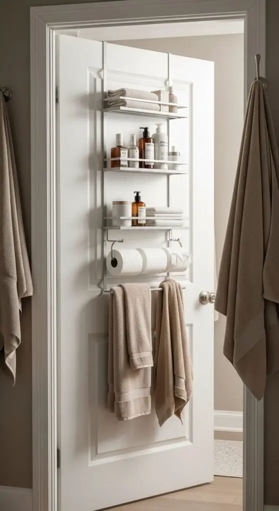 Install over-the-door towel racks that hold multiple bath towels while keeping them easily accessible. Space efficient shelving units designed for doors can store toiletries, cleaning supplies, and extra tissue rolls. You’ll maximize every inch without sacrificing style or accessibility.