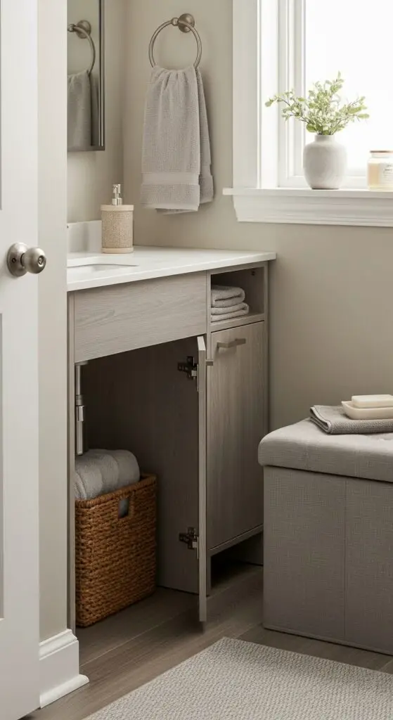 Choose ottomans with lift-up tops for storing extra toilet paper and towels. Install discreet drawer organizers within your vanity to separate small items like medications and grooming tools. Consider ladder shelves that provide open display space above and closed storage below, giving you flexibility to showcase decorative items while hiding everyday necessities.