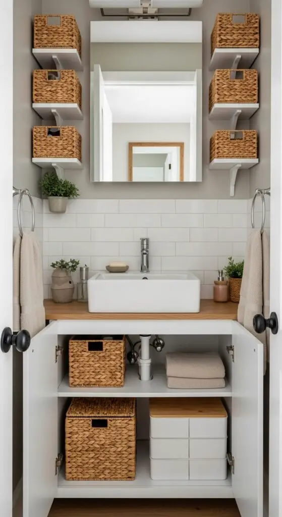Small containers and baskets convert chaotic half bathroom spaces into organized havens where every item has its designated place. You’ll maximize efficiency by selecting tiny storage solutions that fit your specific needs without overwhelming the compact area.