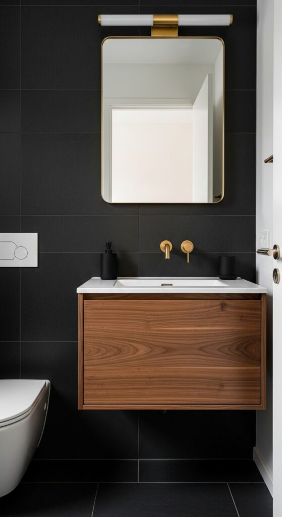 Dramatic charcoal accents work beautifully as feature walls behind floating vanities or as floor treatments paired with lighter wall colors. Consider large-format tiles to minimize grout lines and maximize impact. Black half bathrooms showcase bold elegance that transforms even the smallest powder room into a sophisticated statement space. You’re creating a bold statement that changes your powder room into a sophisticated, hotel-inspired sanctuary.