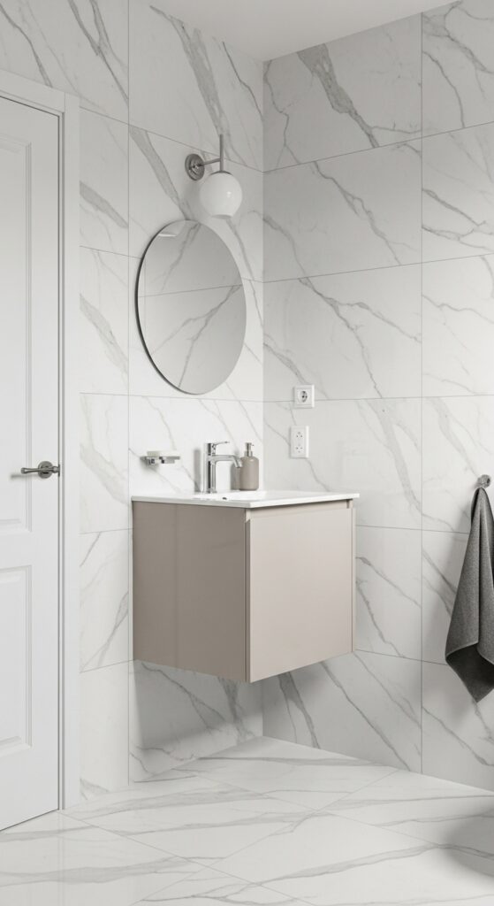 Install large-format tiles to minimize grout lines and enhance the authentic marble appearance. Position natural stone veining vertically on accent walls to create height and visual interest.