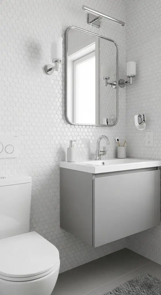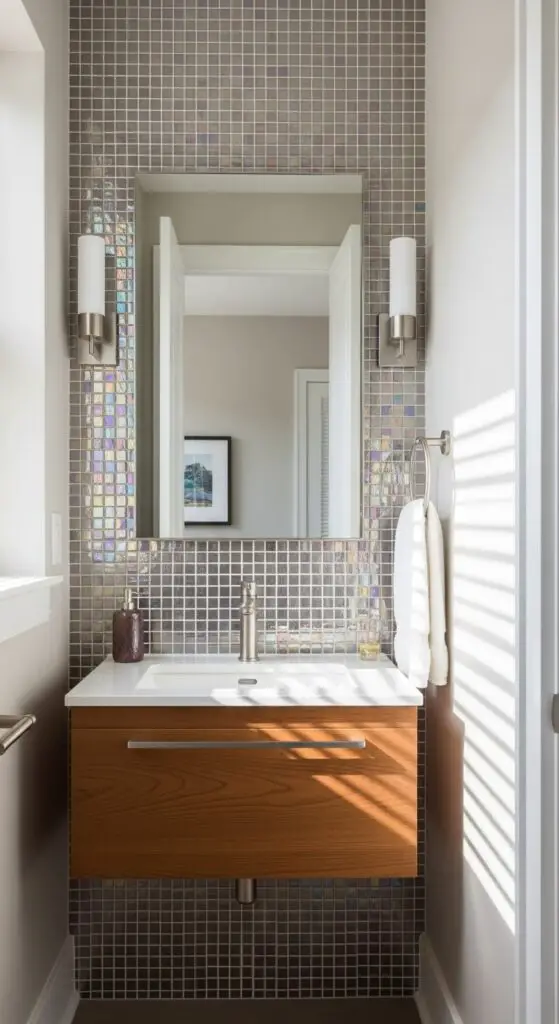 Install metallic tiles as backsplashes behind floating vanities or create dramatic accent walls that become conversation starters. Reflective surfaces amplify natural light, making your compact half bath feel more spacious and inviting.